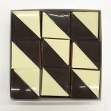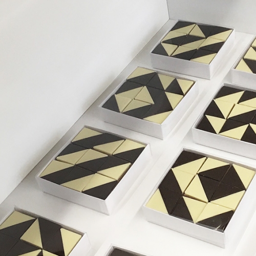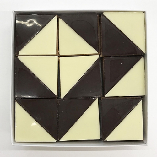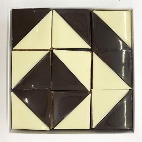 Dans le cadre de l'exposition "Revue" L'artiste propose une composition en praliné inspirée de carreaux noirs et blancs en céramique algérienne. Jouant sur les possibilités qu'offre le triangle, il décline avec 2 x 9 pièces par boîte, 9 motifs différents.
