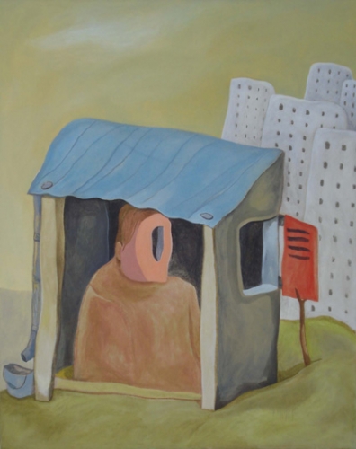Né en 1972, cet artiste valaisan, fils de peintre, issu de l’ESAV (Ecole Supérieur d’Arts Visuels, Genève), expose et publie régulièrement depuis une vingtaine d’années. Il vit et travaille à Lausanne depuis 1991. Alexandre Loye aime voyager à pied, en observateur. Il peint ce qu’il a vu selon ce qu’il en a retenu, tel que son esprit l’a perçu. Dans son atelier, à l’aide de pigments qu’il mélange à la caséine, il redonne vie aux images familières, en un vocabulaire qu’il conjugue de multiples façons sur la toile: un arbre devant un immeuble, un arbre dans un immeuble, un arbre sur une main, un immeuble sur un arbre, l’arbre plus petit ou plus grand que l’immeuble... Les images du dehors deviennent alors comme un intérieur, qu’il rend feutré par un tracé simplifié, calme et rond, et par la douceur et la légèreté de ses teintes. Un personnage énigmatique apparaît parfois, qui semble passer d’une image à l’autre, faisant ou défaisant le fil d’une histoire imaginaire.Comme la chronique d’un univers protégé, où l’agressivité urbaine a été apprivoisée et mise sous cloche, la vision d’Alexandre Loye nous emporte dans une réalité cocasse et suspendue, empreinte d’un parfum d’innocence retrouvée...