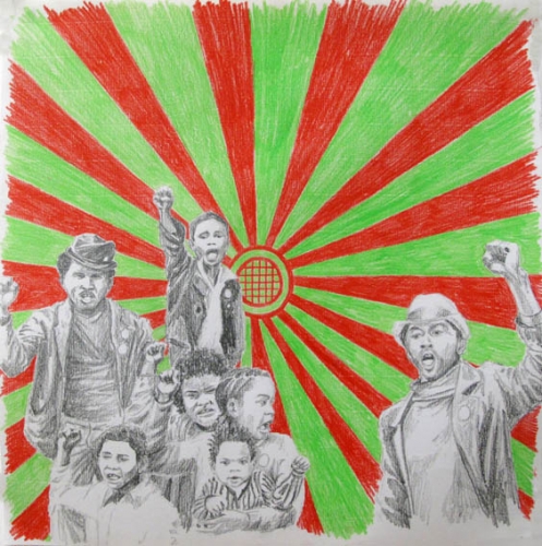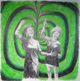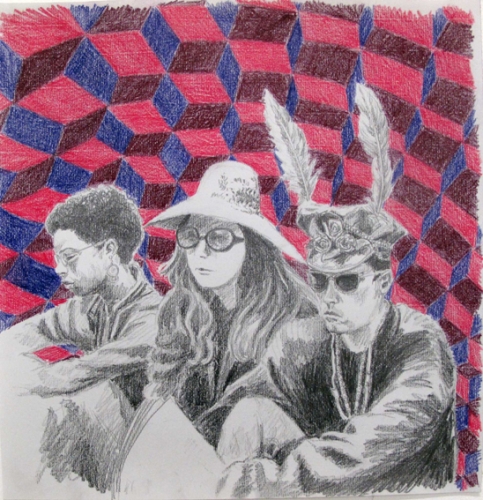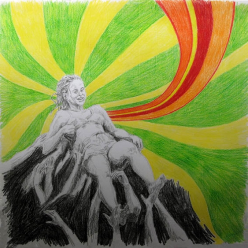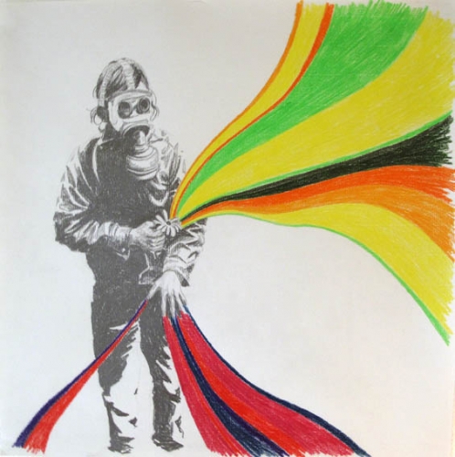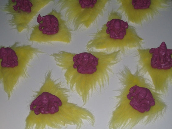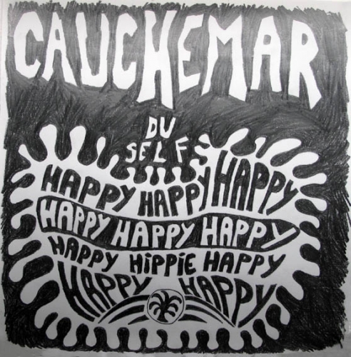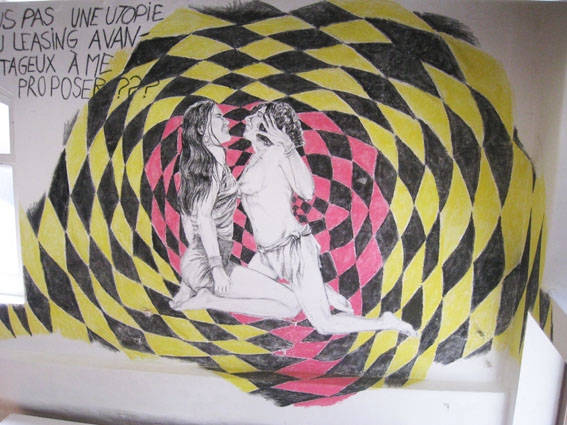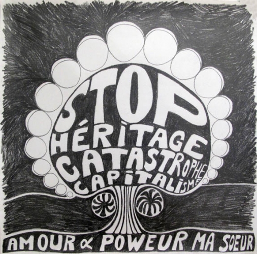 Cette jeune artiste jurassienne née en 1982 a choisi ici l’iconographie des années hippies comme base de données. Elle met en images la force de cette contre-culture et de ses mouvements révolutionnaires sur fond de motifs psychédéliques, elle module les slogans dans la même esthétique. En plus du dessin, son expression favorite, elle se sert de médiums variés pour réaliser la globalité de cette exposition et développer différentes atmosphères. Sculptures spatiales, sanctuaire, cahier-tract (édition davel 14) et figurines à l’effigie du dieu Ganesh (édition Action Flac) offrent à cette errance l’idée d’un recueillement possible.